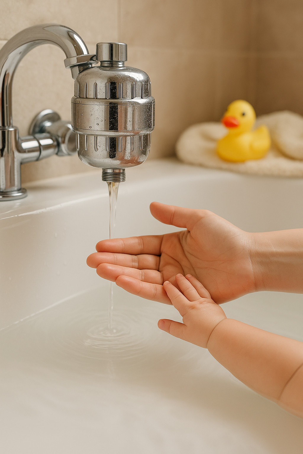 When hot water meets chlorine and certain chemicals in tap water, they don’t just stay in the water — they evaporate into the air, which is inhaled during bath time.