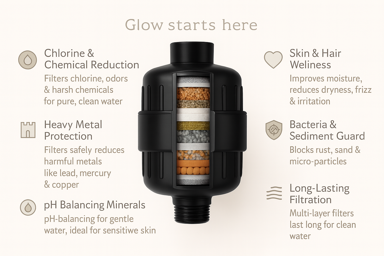 The Flovella™ Spa-Grade Shower Filter transforms ordinary tap water into a cleaner, skin-friendly experience. As water passes through the multi-layer filtration system, it first captures visible impurities such as rust, sediment, and colloids, followed by chlorine and heavy metals that often trigger dryness and irritation.